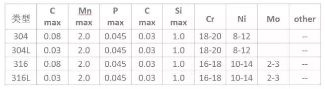 不锈钢:耐空气、蒸汽、水等弱腐蚀介质或具有不锈性的钢种。通常使用的钢种为304、304L、316、 316L,是奥氏体不锈钢的300系列钢。